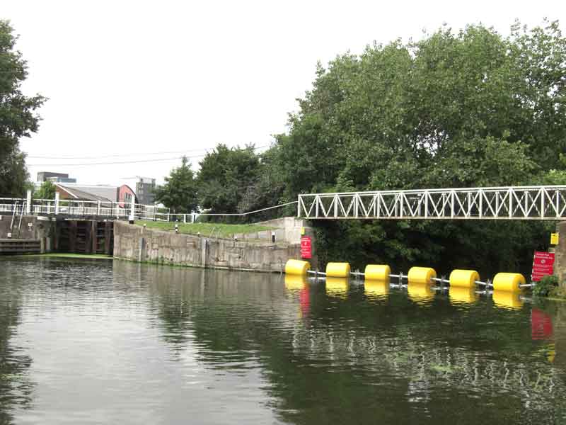 Just down stream of Old Ford lock is one of the entrances to the waterway surrounding the Olympic games site which was barricaded off during the construction phase. The waterway was used extensively to ferry construction materials to the site thus avoiding a lot of road transport. |