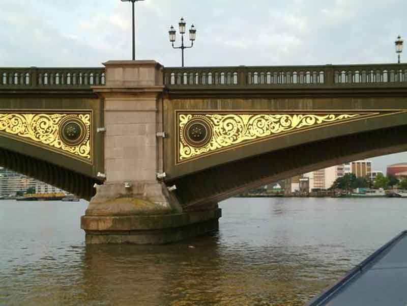 This is probably the most beautiful bridge over the Thames. It is built of Cast Iron and Granite and connects Battersea in the south with Chelsea in the north. It was opened in 1885 and replaced the last wooden bridge over the Thames dating from 1771 |